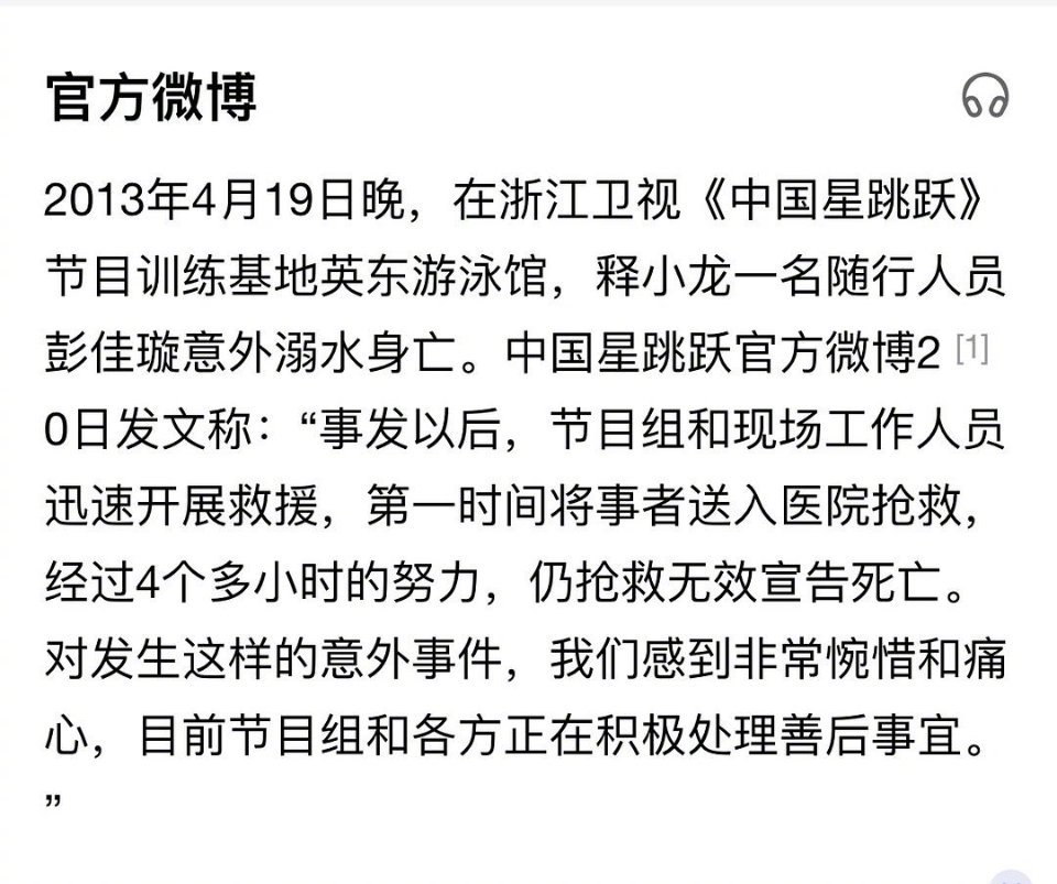 释小龙助理,在陪同参加节目的情况下溺水身亡。