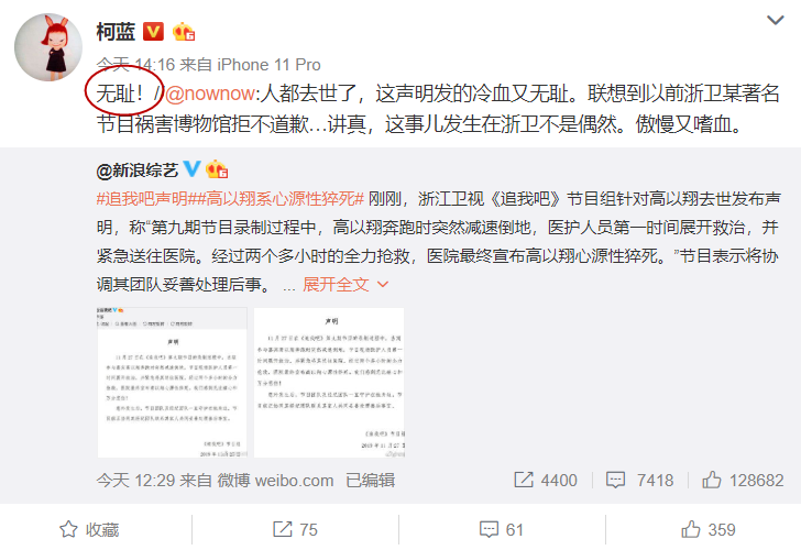 女星柯蓝用“无耻”二字表达自己的态度,随后,柯蓝也转发“综艺节目该设置高危挑战吗”的投票微博,显然,柯蓝本人也对这种毫无意义的节目形式而感到愤怒。