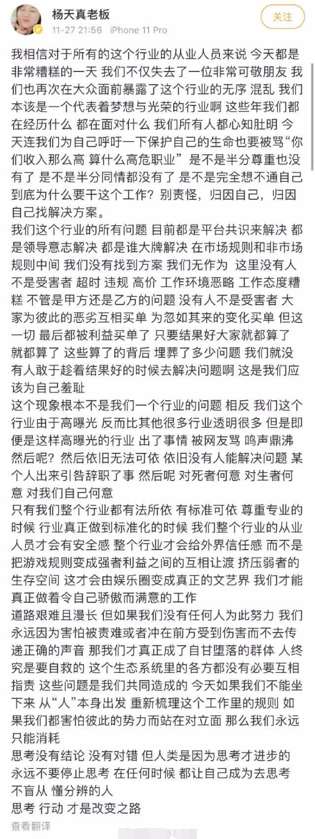 徐峥、杨天真、邓超等多位艺人相继在社交平台表明了自己的态度,徐峥更是直言不讳的表示节目组需要负责任,杨天真谈及此事也是称如今的行业实在太过混乱,只是为了利益去买单,没人想着解决问题,呼吁整个行业进行思考跟改变。