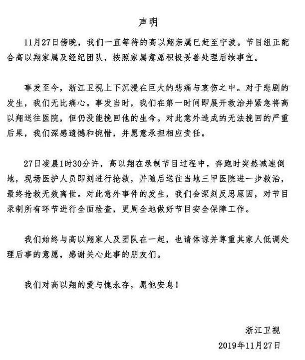 两份声明都强调在第一时间展开了救治,但这个与参加节目组的其他嘉宾现场反应和网友爆料有些出入,真相还有待进一步核实,暂时不好妄下结论。但是对于艺人熬夜长时间录制高强度的奔跑真人秀节目会对人身体健康造成影响甚至危及生命这一点,无论是节目组还是浙江卫视,都没有直接回应或者承认,但这恰恰是网友们最关心的问题,也是很多人认为的事故重要诱因。