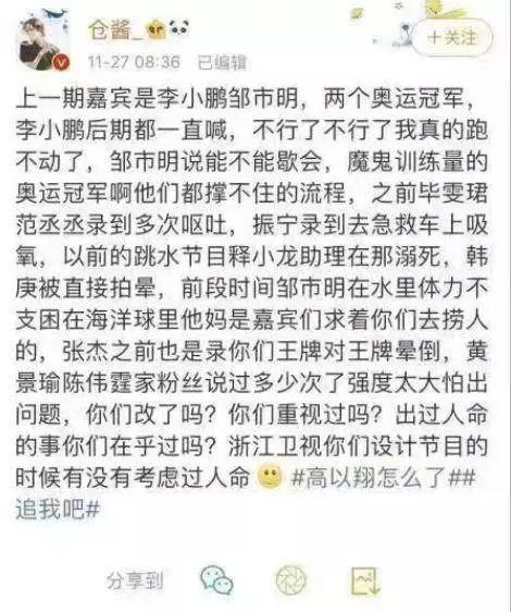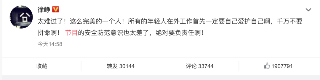 事后,跟高以翔有过合作的徐峥发微博斥责节目组安全防范意识太差了。