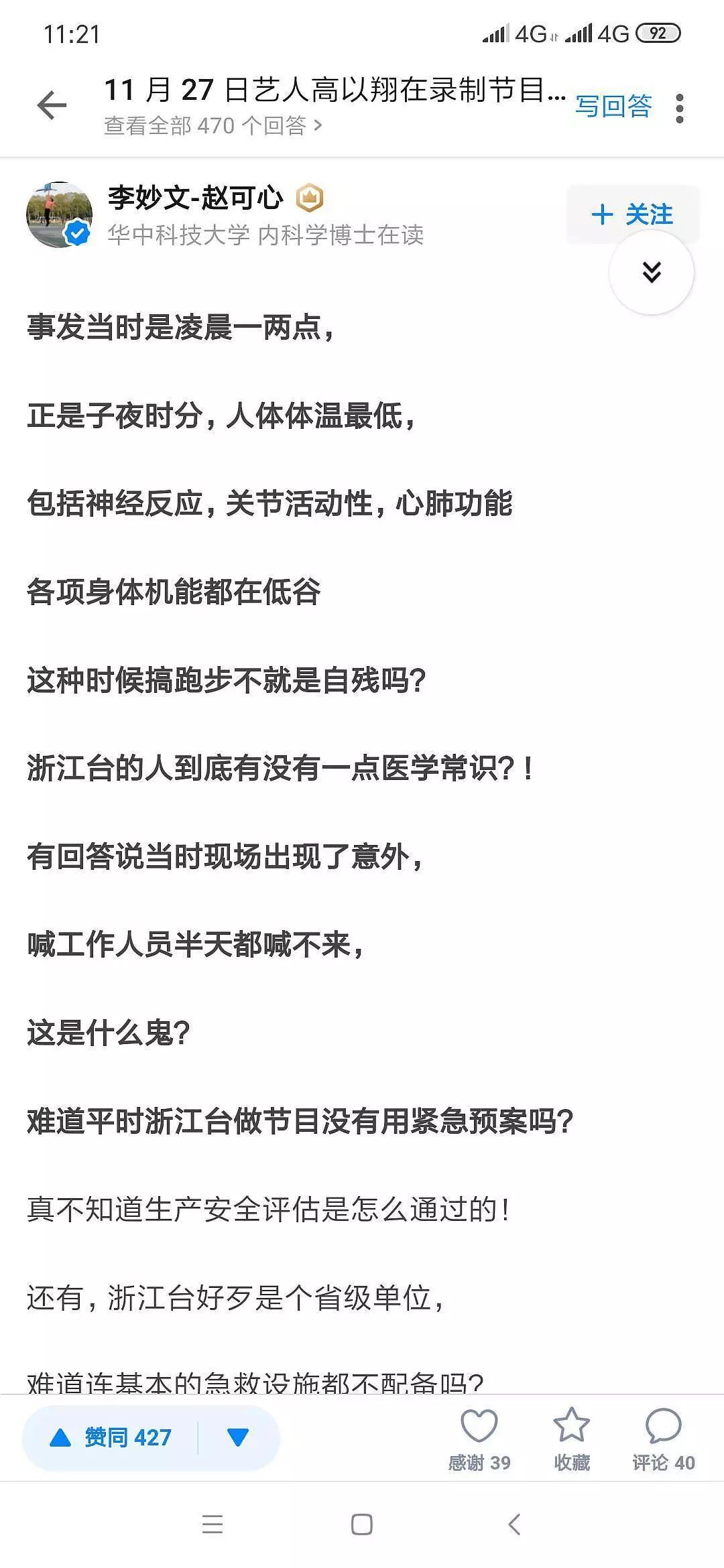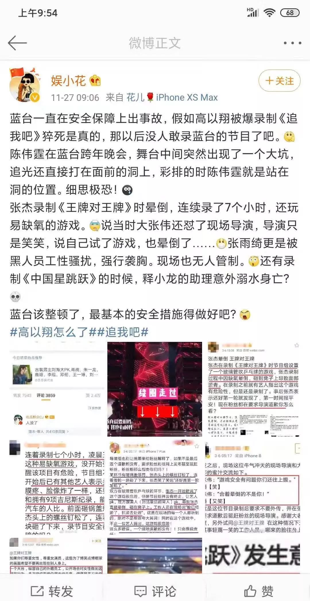 高以翔出事后,有朋友爆料,他最近身患感冒,可能原本体能就不是最佳状态,然而,节目组,没有任何专业人员,对嘉宾的体能做评估,直接让他们上场,持续不间断,熬了好几个大夜,录了17个小时。