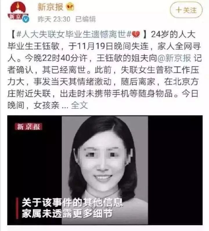 24岁的人大女生,毕业后在知名基金公司工作,竞争激烈,每天工作都超过10点,却只能拿6000的月薪,因为压力过大,看不到希望而自杀。