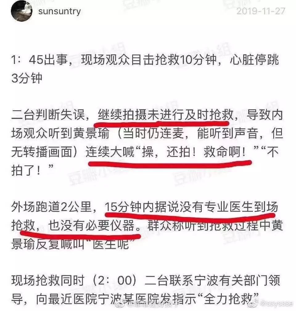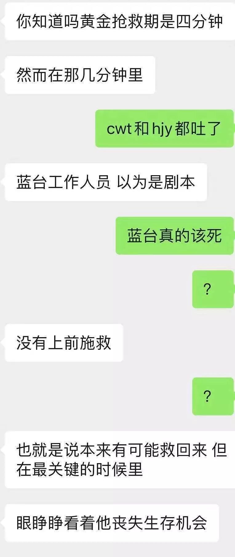 高以翔晕厥的时候,工作人员以为是节目效果,压根无人施救,同在现场的黄景瑜不断爆粗口,才有人过来,硬生生错过黄金抢救时间,没有专业人员到场,现场的救护车也仅仅是摆设,缺少必要的仪器。