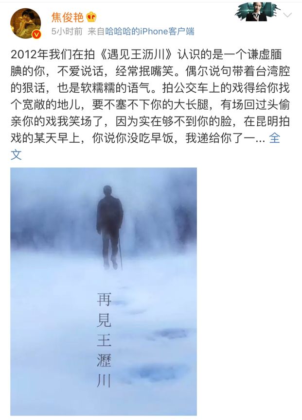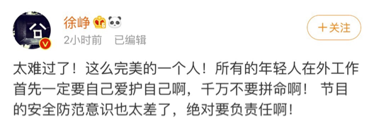 徐峥也发文称:“太难过了!这么完美的一个人!”