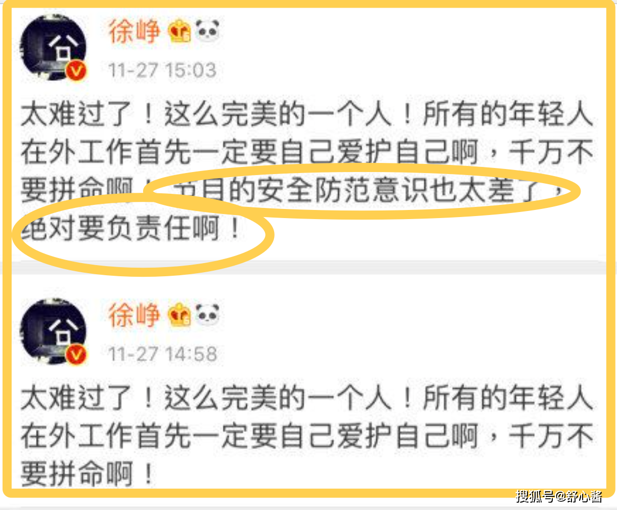 值得关注的是,在发文之后、徐峥又重新编辑了这条内容,更改了表述,增加了一句非常有指向性的话语“节目的安全防范意识也太差了,绝对要负责任啊!”
