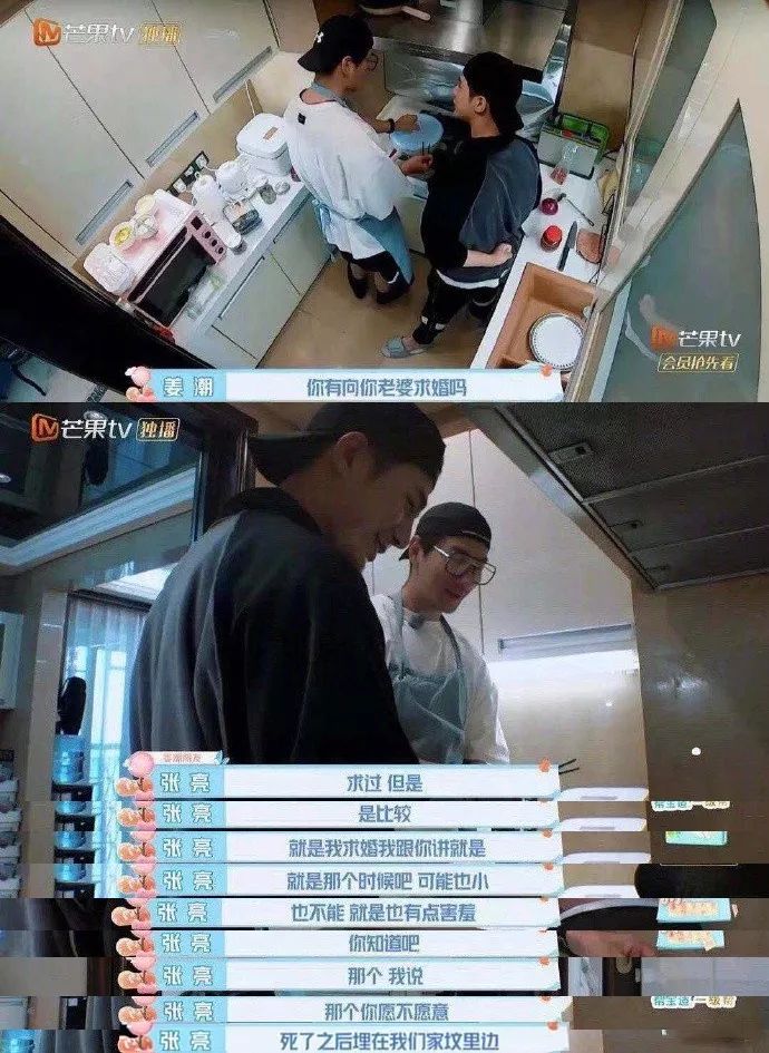 今年7月,张亮在录节目的时候,姜潮问张亮是否向妻子求过婚,他支支吾吾,最后还是说了: