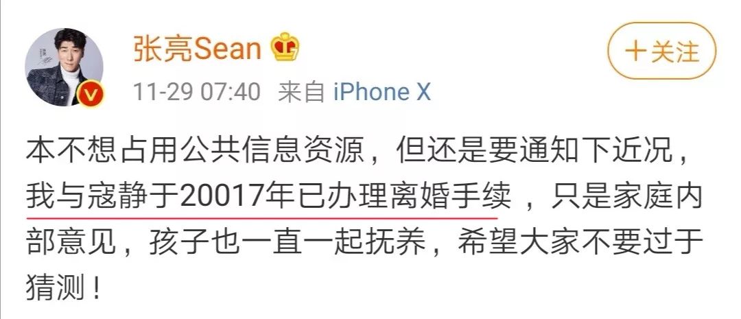 11月29日早上7点40分,张亮发微博宣布与妻子寇静离婚的消息——