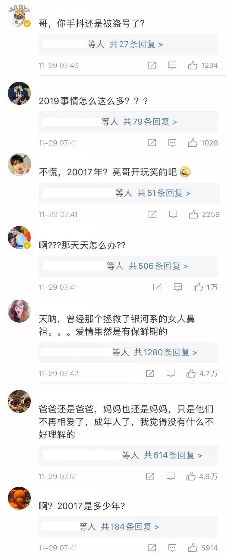 网友们知道这个消息后,纷纷表示不敢相信,称:“哥,你手抖还是被盗号了?”、“啊?那天天怎么办?”、“不慌,20017年?亮哥开玩笑的吧”.......