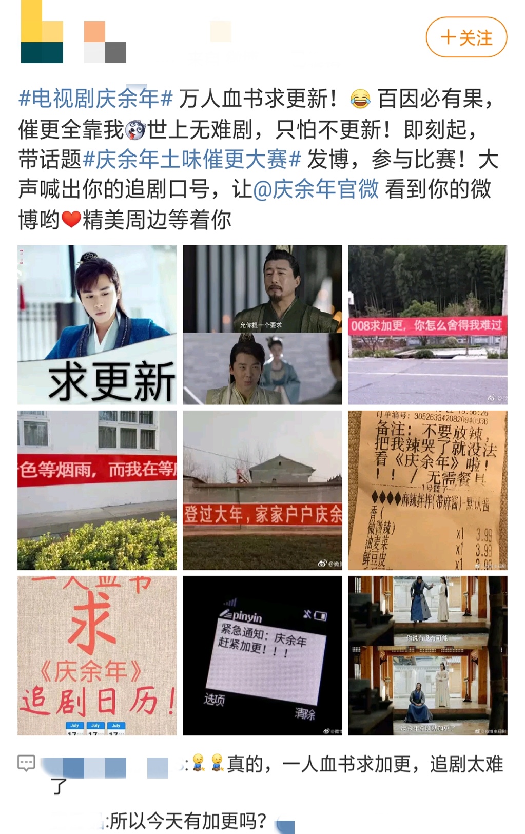 网友纷纷喊话太上头,催更赶紧更新,等不及了。为此,网上还有一个《庆余年》土味催更大赛,网友们为了崔更真是拼尽全力了啊,制作了大批表情包,为求崔更,甚至喊话第2季,第3季也快点准备吧。