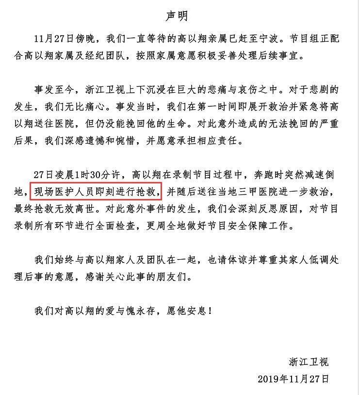 不过关于现场是否有效急救高以翔一事,此前浙江卫视给出的答案是“医护人员即刻进行抢救”。