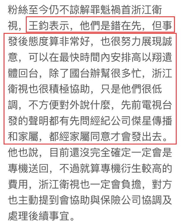 而高以翔家人以及经纪公司这边,虽然在事发之后一直都给人十分温柔的印象,但昨日也是有媒体报道,高以翔经纪公司老板在接受采访时也是坦言“浙江卫视有错在先”,不过在事发后态度很好。
