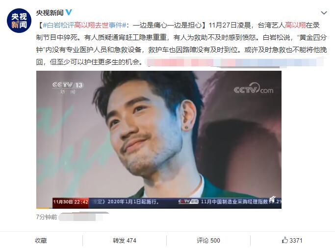 高以翔在35岁的年纪遗憾的去世在近几日来备受网友关注,从最初高以翔遗体是否能顺利回到台北,到目前网友们的关注点已经落在了现场急救时节目组是否配备相关器械,是否有效的急救等等。