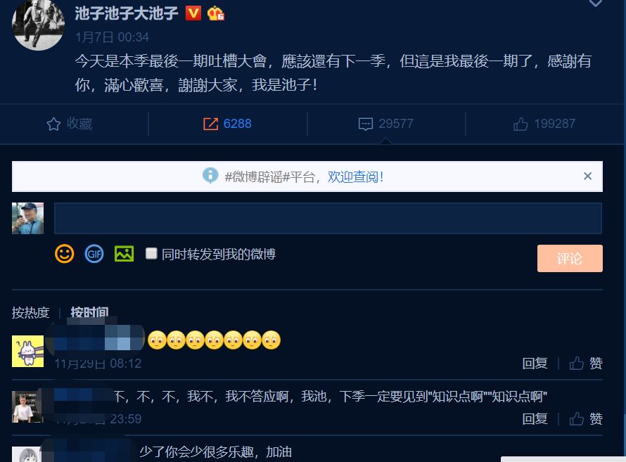 难道李诞真的要逐步走向幕后?可是池子这么有话题点的人为什么也没来呢?在第三季节目结束后,池子发微博表示这是最后一期节目,当时还有不少粉丝遗憾称不能看池子上热搜了,还有网友以为是玩笑。结果池子这样退出了第四季的录制,也是很遗憾。