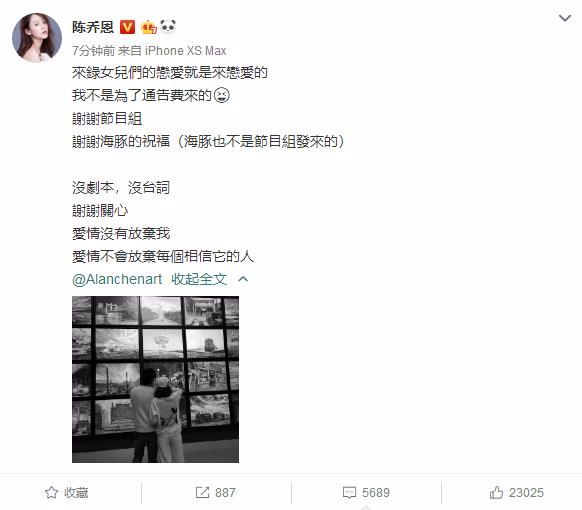 12月2日,陈乔恩晒出跟艾伦的亲密合影,并且发文官宣恋情,称录制《女儿们的恋爱》不是为了通告费,而是为了恋爱,同时还表示节目没有剧本也没台词,更@艾伦,称”爱情没有放弃我,爱情不会放弃每个相信它的人”。
