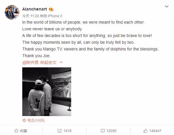 陈乔恩和艾伦官宣恋情,网友们纷纷送上祝福。