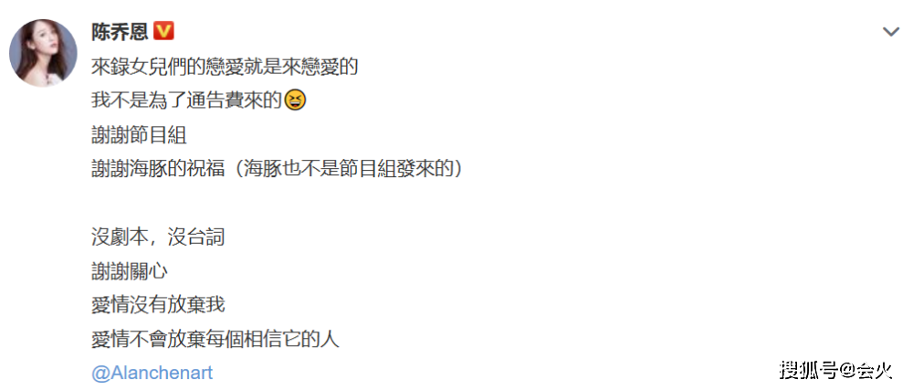 可是在12月2日,似是为了证明自己的恋爱是真心实意的,陈乔恩本人在社交平台声明,称“没剧本、没台词”,一切都以恋爱为目的。