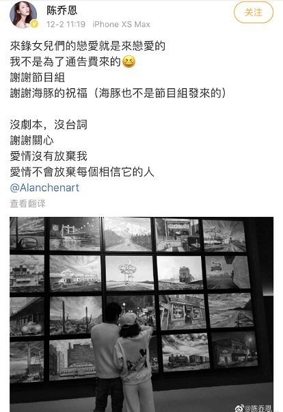陈乔恩和真人秀节目中的男友艾伦牵手成功后,不少网友同样都吐槽是假的。不过,陈乔恩和艾伦则是“官宣”了两人的恋情,并且说来录节目就是来恋爱的,没剧本没台词,爱情没有放弃我。