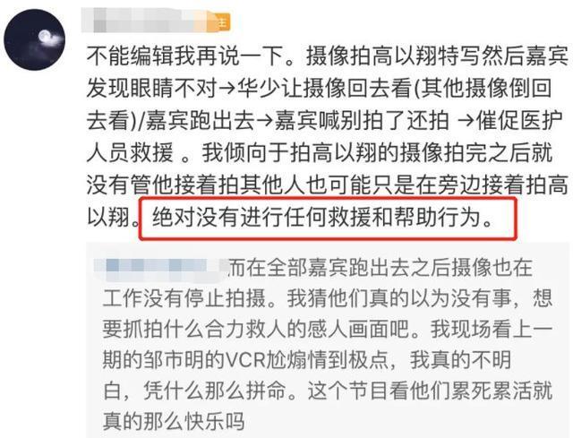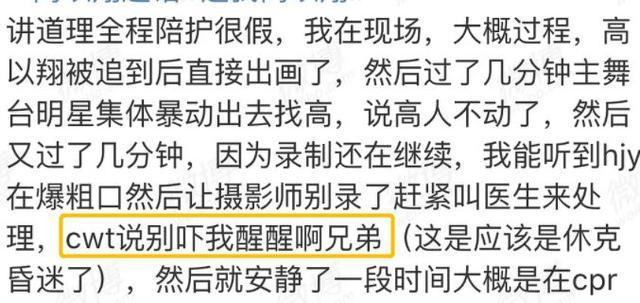 网友都特别担心这些艺人的心理状况,特别是随着越来越多的现场观众爆料:高以翔出事后,没有得到及时的救助行为,首先发现的并且要求救助的是艺人们,画面感极强,光看文字都令人难受。