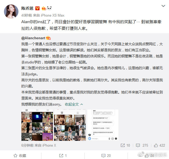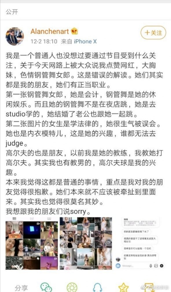 在12月2日,艾伦曾伟昌就发微博回应了这件事:说点赞美女是对我的误解。她们都有正当职业,跳钢管舞是她们的兴趣爱好,她们都是我的朋友,对牵扯到这件事的朋友感到抱歉。随后陈乔恩也力挺男友称Alan你要红了。不过,这对相差9岁的恋情让许多人都不看好,许多粉丝在陈乔恩微博下纷纷评论表示要脱粉。