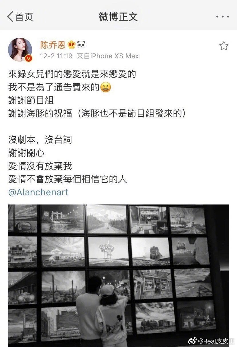 40岁的陈乔恩今年参加节目《女儿们的恋爱》终于找到心中所属。节目中一起坐游艇、做陶瓷、牵手拥抱,最后陈乔恩与男友曾伟昌两人走到一起。不过不少网友认为这一定有剧本,到现实中不可能走在一起。就会像张睿轩和任家萱之前那样,节目一完两人就结束爱情发展。