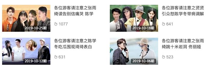 并且很有意思的是,《花儿与少年》的每一期的看点提示都是内容相关,比如购物、租车、冲突……