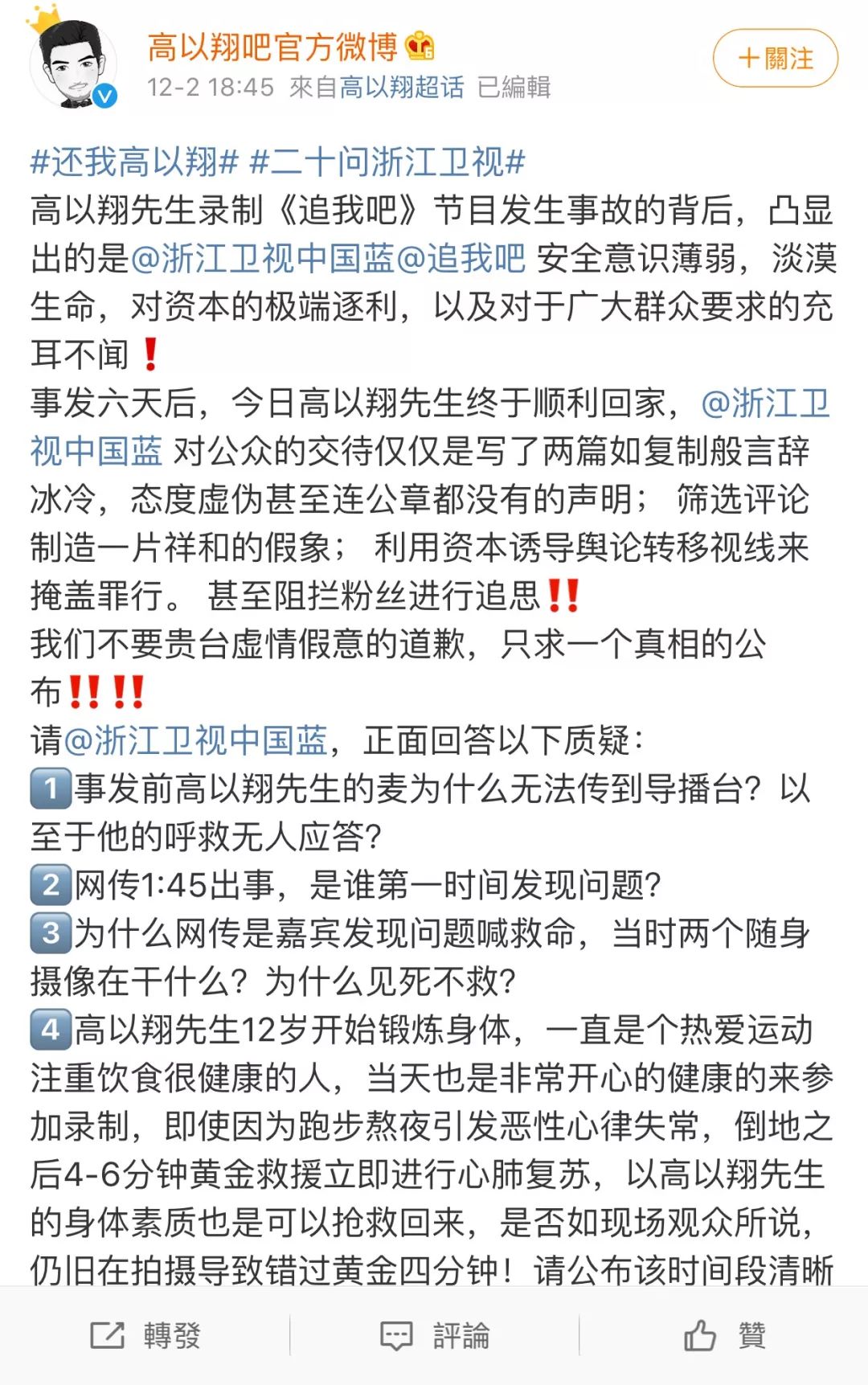 目前虽然高以翔遗体已被送回台湾,但这件事并没有结束,至少浙江卫视还未正式地回应网友对出事当天细节的疑问,也始终未给高以翔和其家人一句正式的道歉。