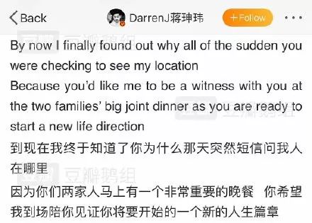 蒋珅玮在长文中写到有一天高以翔突然短信问他人在哪,而他当时正是想邀请好友见证自己即将开始的新的人生篇章,也就是高以翔那时已经有了向女友求婚的计划!