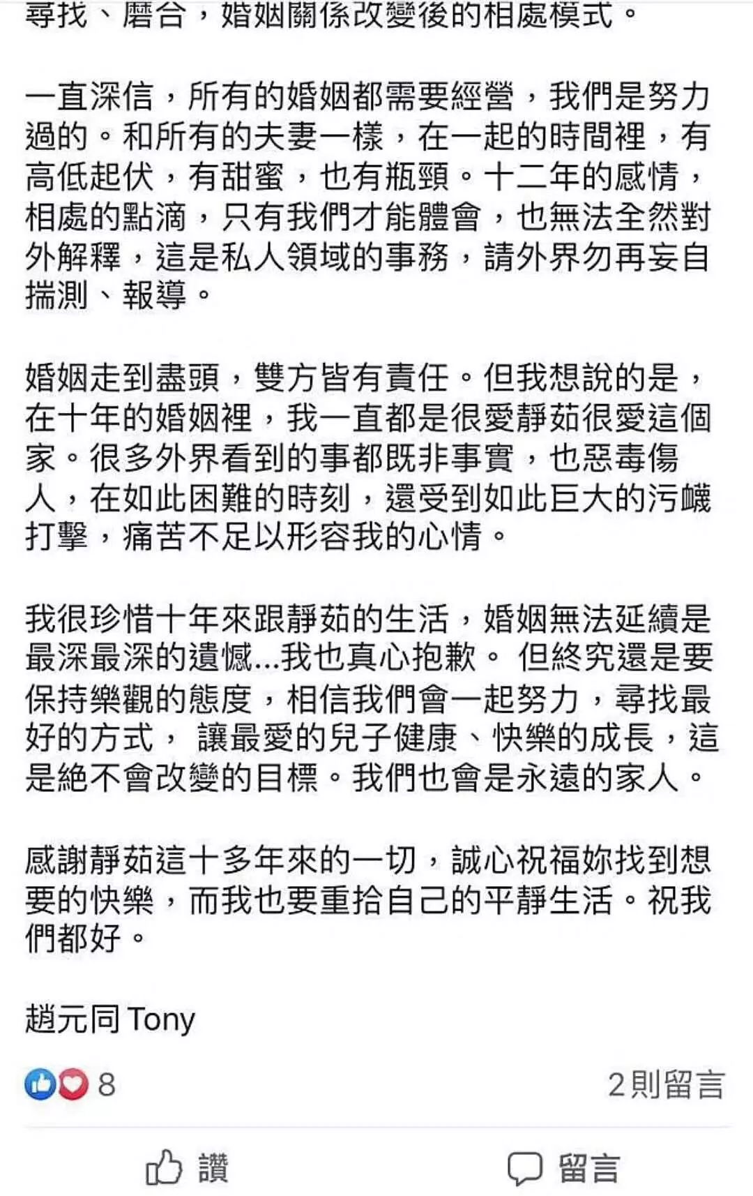 赵元同还表示,婚姻走到尽头双方都有责任,离婚不是想要的结果,他深表遗憾。他还感慨自己很爱梁静茹,祝福梁静茹找到自己的快乐。