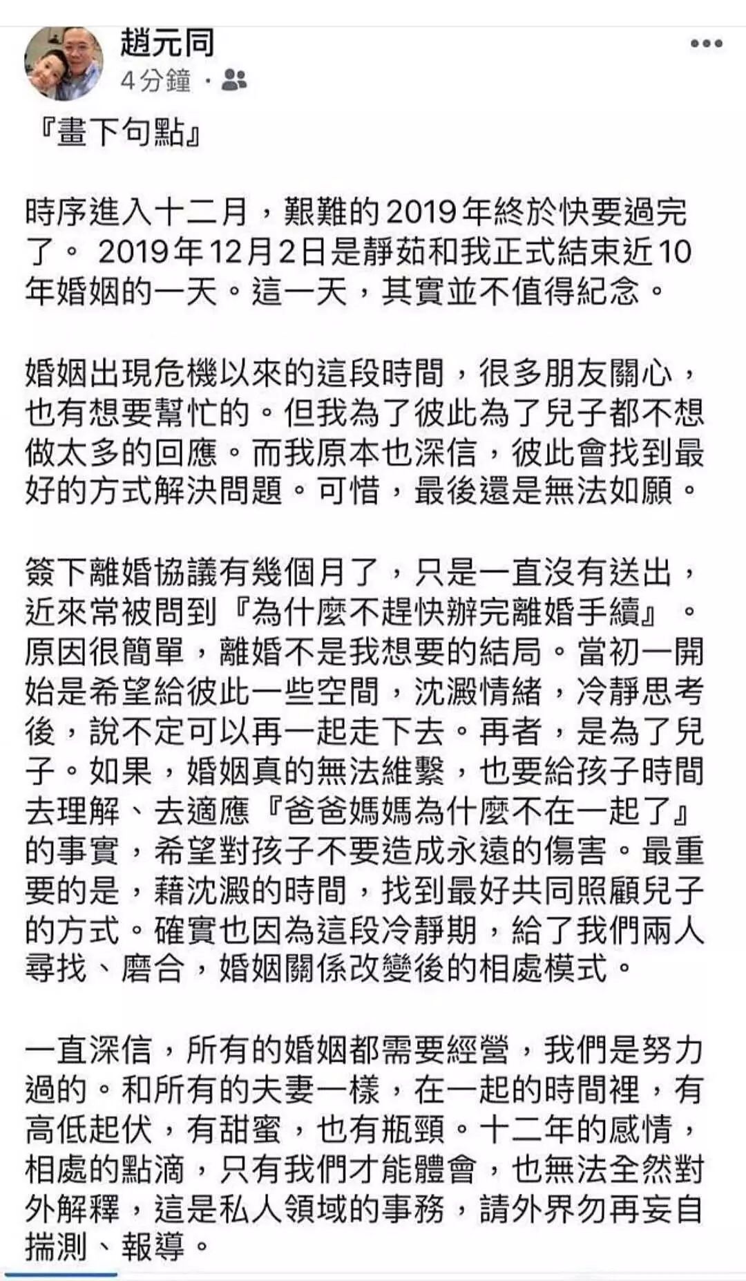 今日上午11点,梁静茹前夫赵元同在社交平台宣布签字离婚,近10年的婚姻正式画下句点。