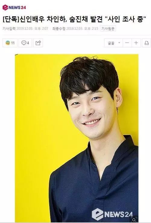 12月3日,韩国娱乐圈又传来一个噩耗,知名男星车仁河被发现在家中死亡,具体死亡原因正在调查中。车仁河的公司Fantagio娱乐表示“听到消息目前正在确认中”。