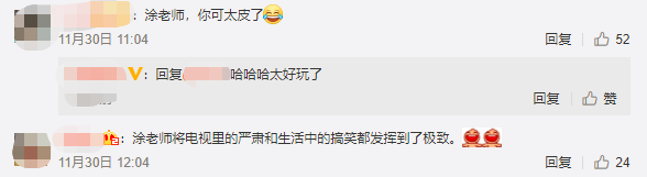 网友纷纷评论,称涂磊太好玩了,将电视里的严肃和生活中的搞笑都发挥到了极致。
