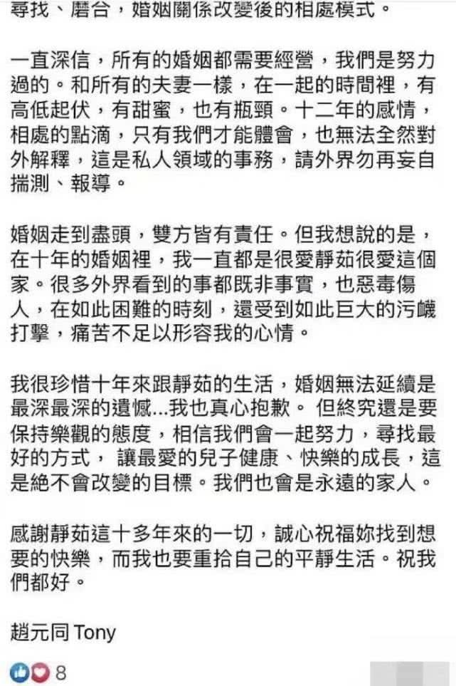 12月2日,梁静茹与赵元同的离婚登记终于办理成功,9年的婚姻总算宣布告一段落。在发文宣布了离婚后赵元同在社交平台上发文澄清近期以来发生的种种事情,婚姻出现问题没有办理离婚是想让双方都冷静一下,称是为了孩子,还矢口否认了自己出轨一事。