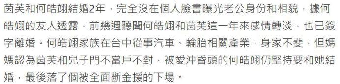 但在现实中,过惯了豪门生活的何皓翊根本适应不了一般人的生活,每个月薪水只有几万台币,光是负担家庭的日常开销就入不敷出。所谓的贫贱夫妻百事哀,没有钱的日子让二人的摩擦越来越多,据何皓翊友人透露,前几周听说茵芙跟何皓翊感情转淡,已经签字离婚了。