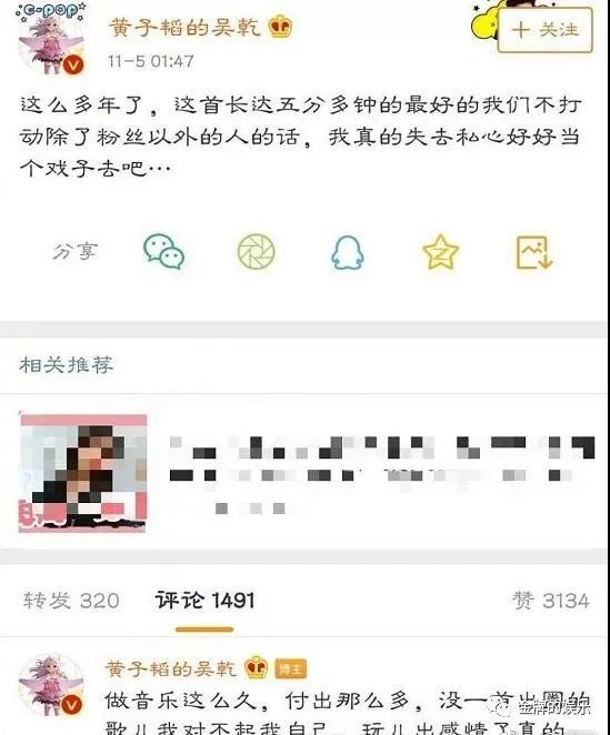 11月5日凌晨,黄子韬在社交账号的一席话惹得热议,他说:“这么多年,这首长达五分多种的最好的我们不打动除了粉丝以外的人的话,我真的失去私心好好当个戏子去吧。”他还在评论区还感慨自己做音乐这么久但却没有得到一首拿的出首的作品,很是对不起自己。但话语一出,网友就表示出了不满,大家不满的缘由是因为黄子韬的配文中用了“戏子”一词,这个词本身就有一种轻蔑的成分在里面,黄子韬在场合这么形容演员,很是情商低下。