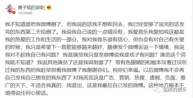 本以为此事就此过去,黄子韬又在自己的微博发声,他表示:“上条微博被删并不是自己所为,但说过的话不想收回,微博只是倾诉一下情绪,戏子并没有代指谁,只是在说自己,希望不要扭曲他话中意思,还表示自己以后不会在微博上发出自己内心想法,从此退出微博。”微博一经发出,令人哗然,粉丝们表示出对黄子韬的支持。
