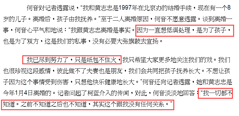 何音后来曾接受媒体采访,她表示考虑到孩子的心理健康,离婚只想低调处理,不愿透露过多私事。被问到关于柯蓝的话题,何音的回答也很谨慎,表示她对此从来都不知情。小8觉得,如今娱乐圈里借离婚炒作的明星比比皆是,离婚后依然为对方保全体面,才体现出何音的宽容与大气。