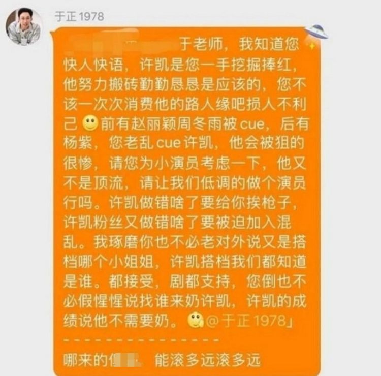 另一方面,于正的毒舌也实在让人难以接受,直接开骂许凯粉丝,不仅伤了许凯粉丝们的心,也让自家的艺人很为难。
