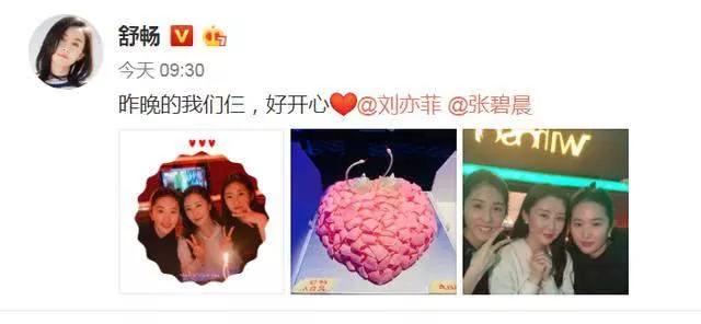 12月1日,舒畅刚过完自己32岁的生日,12月4日她在个人社交平台晒出一组庆生照,网友一看顿时不淡定了,照片上陪在舒畅身边的竟然是刘亦菲和张碧晨,三人还都是以近乎素颜的淡妆出镜,网友惊叹这到底是什么神仙同框!小姐姐们也太好看啦!