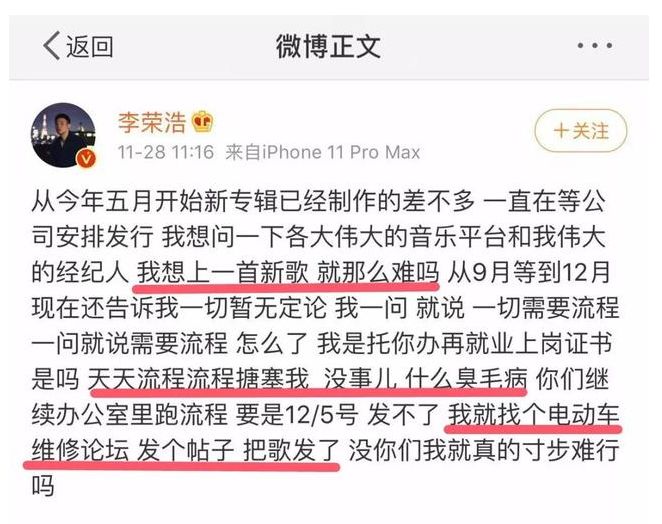 11月28日,李荣浩发微博痛斥自己的经纪人和各大音乐平台。称一首歌的发行从9月份一直拖到了12月,一旦问及就被以流程为由搪塞。
