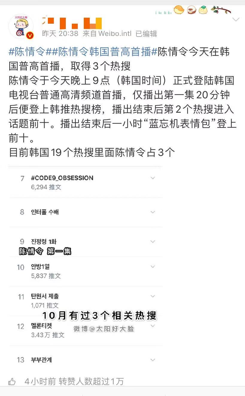 《陈情令》11月4日在韩国播出,网友爆料,仅播出一集,结果有三个与电视剧有关的内容上了推特韩网热搜。播出结束两个热搜冲进前十,播完一个小时,“蓝忘机表情包”也冲进热搜前十。OMG,看来这腐女真是无处不在。