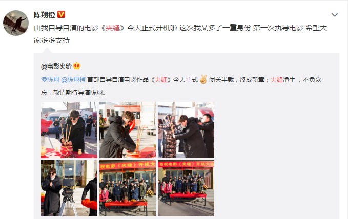 近日,陈翔在社交平台自曝新戏《夹缝》开机,这一次,他将正式从演员转型为导演。