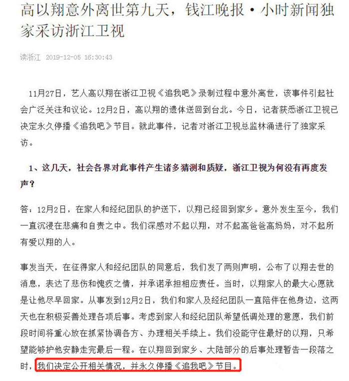 12月5日,在高以翔参加浙江卫视《追我吧》节目猝死后的第九天时,此事依然频繁陷入舆论声中被频繁讨论,而作为事件的“当事人”,浙江卫视方面也终于有人对此事进行全方面回应,并通过文字还原了当时高以翔离世事件的始末。