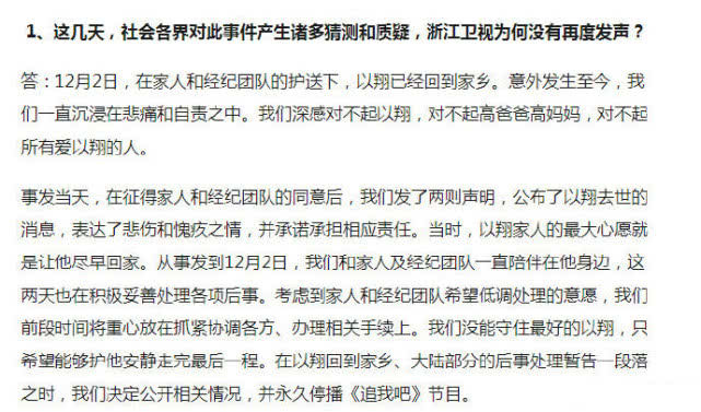 因为一直沉浸在悲痛跟自责中,对不起高以翔及他的爸爸妈妈跟所有爱高以翔的人,在征得同意后公开了去世的消息,事发至今一直陪在他的身边,正在妥善安排后事,家人跟经纪公司也希望去低调处理,等待高以翔的后事处理完毕将要停播《追我吧》节目。