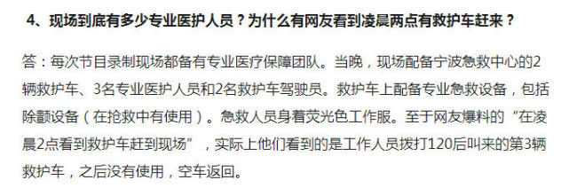 对于当时的现场,该总监也进行了还原,凌晨1点26分左右高以翔开始录制,到1点30分52秒躺倒发生异样,倒地1分46秒现场医护人员就已经赶到实施抢救,随后送往医院。当天也有相关的急救设备,急救人员穿着荧光色工作服。