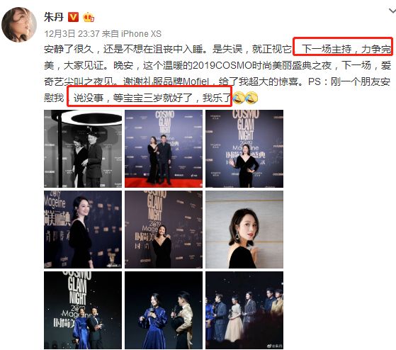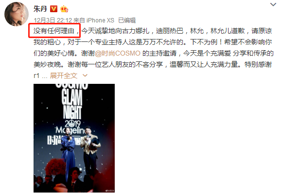 在事后,朱丹还连发了三条微博为自己的失误感到抱歉,虽然文字上诚意满满,但是在配图上配的都是自己灿烂笑容的美照,还不忘提一下赞助商。