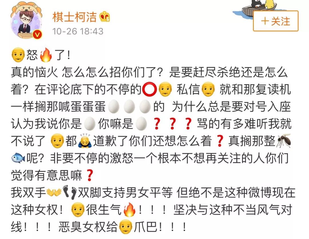 而柯洁事后因为意识到自己“嘴臭”,奈何抵不住网友的势力强大,才删掉了微博,并发了两条道歉微博,但是语气是非常不服的。