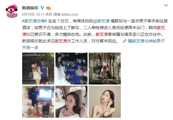 今年六月,娄艺潇就被拍到深夜与一男子牵手去酒店,而这个过程中娄艺潇似乎醉到不省人事。不过没多久这个传闻就被娄艺潇的团队否认了。