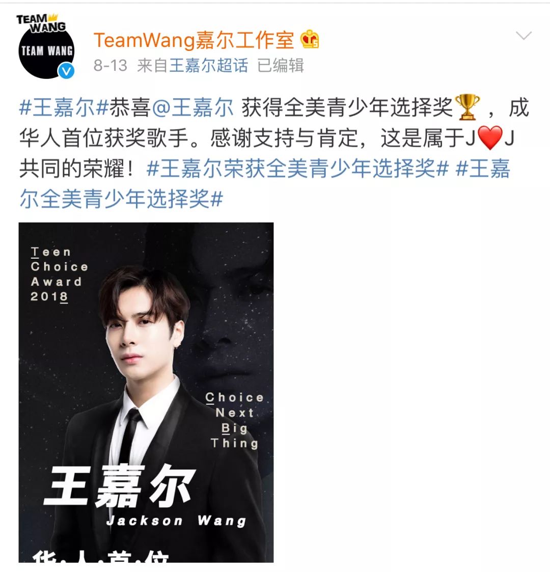今年8月,工作室宣布王嘉尔获得全美青少年选择奖,成为华人首位获奖歌手,这无疑不是对他歌手身份的最佳认证,以及各大榜单的排名都是对他作为音乐人的认可
