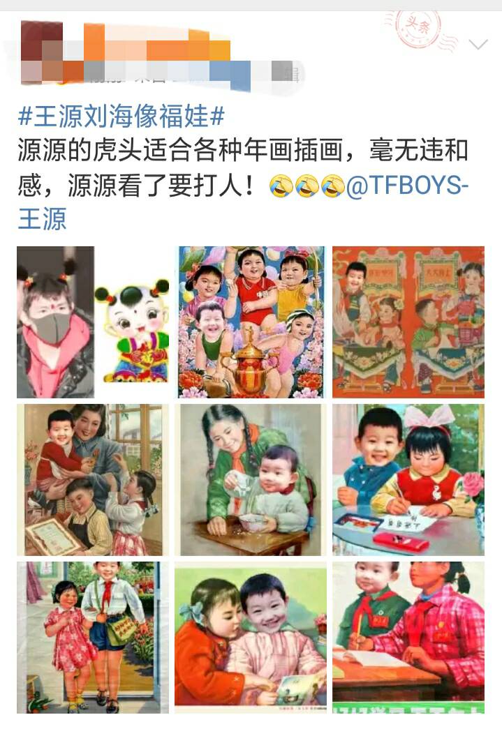 细心的网友发现,王源的头发十分服帖,软软的,好想上手rua一把。这刘海分明就是撞脸福娃啦,快要过年了,是准备把自己打扮成福娃拜年吗?更有网友把王源的虎头照片插入了各种年画插画中,毫无违和感,王源看了可能要打人,哈哈哈。